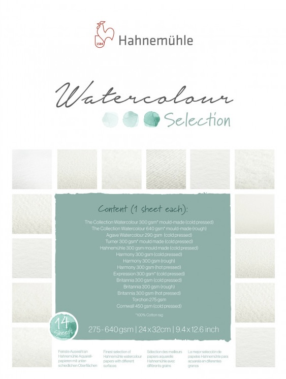 Na závěr bych vám ráda bych doporučila blok od hahnemühle. Objevila jsem ho nedavno a mám z něj radost. Myslím, že ho ocení jak začátečník, tak i pokročilí akvarelista. Jedná se o vzorník papírů nejrůznějšího složení, vyzkoušíte si různé gramáže včetně 640g. Spoustu struktur přes pergamenové, hrubé rought až po krásně sametově hladké hot press a to vše v jednom bloku.